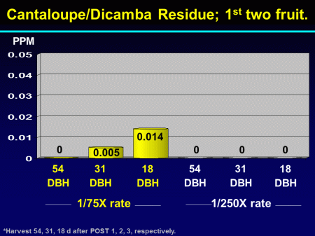 Cantaloupe/Dicamba Residue; 1st two fruit.<BR>*Harvest 54, 31, 18 d after POST 1, 2, 3, respectively.<BR>1/75X rate <BR>1/250X rate <BR>0.014<BR>0.005<BR>0<BR>0<BR>0<BR>0<BR>PPM<BR>54  <BR>DBH <BR>31  <BR>DBH <BR>18  <BR>DBH <BR>54  <BR>DBH <BR>31  <BR>DBH <BR>18  <BR>DBH <BR>