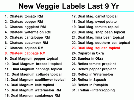 New Veggie Labels Last 9 Yr<BR>1.  Chateau tomato RM <BR>2.  Chateau pepper RM <BR>3.  Chateau eggplant RM <BR>4.  Chateau watermelon RM <BR>5.  Chateau cantaloupe RM <BR>6.  Chateau cucumber RM <BR>7.  Chateau squash RM <BR>8.  Chateau cabbage RM <BR>9.  Dual Magnum pepper topical <BR>10.  Dual Magnum broccoli topical <BR>11.  Dual Magnum cabbage topical <BR>12.  Dual Magnum collards topical <BR>13. Dual Magnum cauliflower topical <BR>14. Dual Magnum kale topical <BR>15. Dual Magnum watermelon RM <BR>16. Dual Magnum cantaloupe RM<BR>17. Dual Mag. carrot topical <BR>18. Dual Mag. sweet potato <BR>19. Dual Mag. tomato topical <BR>20. Dual Mag. snap bean topical <BR>21. Dual Mag. lima bean topical <BR>22. Dual Mag. southern pea topical <BR>23. Dual Mag. squash topical <BR>24. Caparol in Okra <BR>25. Sandea in Okra <BR>26. Reflex tomato preplant <BR>27. Reflex pepper preplant <BR>28. Reflex in Watermelon <BR>29. Reflex in Squash <BR>30. Reflex in Pumpkin <BR>31. Treflan - Intercropping<BR>