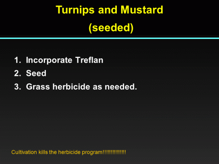 <BR>	1.  Incorporate Treflan <BR>	2.  Seed <BR>	3.  Grass herbicide as needed. <BR>Turnips and Mustard <BR> (seeded)<BR>Cultivation kills the herbicide program!!!!!!!!!!!!!!!<BR>