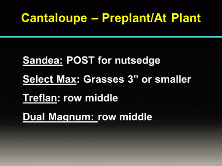Cantaloupe – Preplant/At Plant<BR>  <BR>Sandea: POST for nutsedge <BR>Select Max: Grasses 3” or smaller <BR>Treflan: row middle <BR>Dual Magnum: row middle <BR>