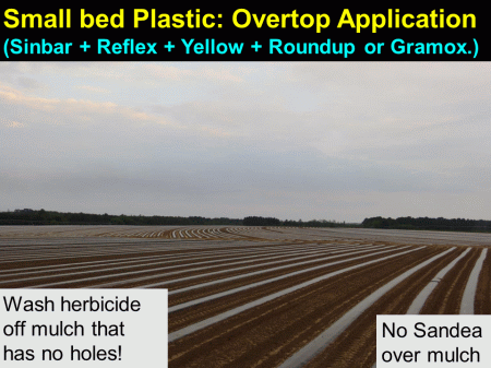 Small bed Plastic: Overtop Application <BR>(Sinbar + Reflex + Yellow + Roundup or Gramox.)<BR>Wash herbicide off mulch that has no holes!<BR>No Sandea over mulch<BR>