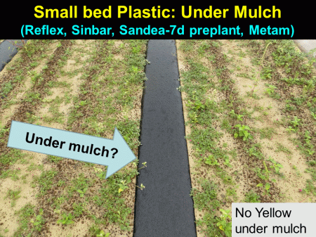 Small bed Plastic: Under Mulch <BR>(Reflex, Sinbar, Sandea-7d preplant, Metam)<BR>Under mulch?<BR>No Yellow under mulch<BR>