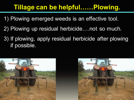 Plowing emerged weeds is an effective tool. <BR>Plowing up residual herbicide….not so much. <BR>If plowing, apply residual herbicide after plowing if possible.<BR>Tillage can be helpful……Plowing.<BR>