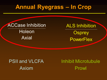 Annual Ryegrass – In Crop<BR>ACCase Inhibition <BR>Holeon <BR>Axial<BR>ALS Inhibition <BR>Osprey <BR>PowerFlex<BR>PSII and VLCFA <BR>Axiom<BR>Inhibit Microtubule <BR>Prowl<BR>