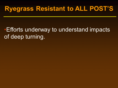 <BR>Efforts underway to understand impacts of deep turning. <BR>Ryegrass Resistant to ALL POST’S<BR>