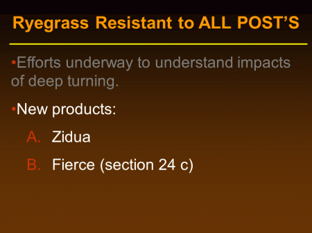 Efforts underway to understand impacts of deep turning. <BR>New products: <BR>Zidua <BR>Fierce (section 24 c) <BR>Ryegrass Resistant to ALL POST’S<BR>