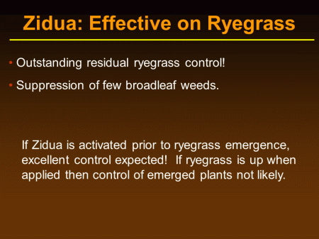 Outstanding residual ryegrass control! <BR> Suppression of few broadleaf weeds.<BR>Zidua: Effective on Ryegrass<BR>If Zidua is activated prior to ryegrass emergence, excellent control expected!  If ryegrass is up when applied then control of emerged plants not likely.<BR>