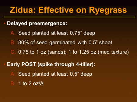 Delayed preemergence: <BR>Seed planted at least 0.75” deep <BR>80% of seed germinated with 0.5” shoot <BR>0.75 to 1 oz (sands); 1 to 1.25 oz (med texture)<BR>Zidua: Effective on Ryegrass<BR> Early POST (spike through 4-tiller): <BR>Seed planted at least 0.5” deep <BR>1 to 2 oz/A<BR>