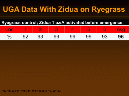 UGA Data With Zidua on Ryegrass<BR>W2-11; W3-11; W14-11; W5-12; W13-12, W1-13<BR>