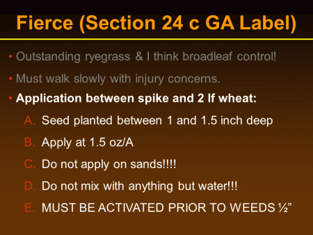 Outstanding ryegrass & I think broadleaf control! <BR> Must walk slowly with injury concerns.<BR>Fierce (Section 24 c GA Label)<BR> Application between spike and 2 lf wheat: <BR>Seed planted between 1 and 1.5 inch deep <BR>Apply at 1.5 oz/A <BR>Do not apply on sands!!!! <BR>Do not mix with anything but water!!! <BR>MUST BE ACTIVATED PRIOR TO WEEDS ½”<BR>
