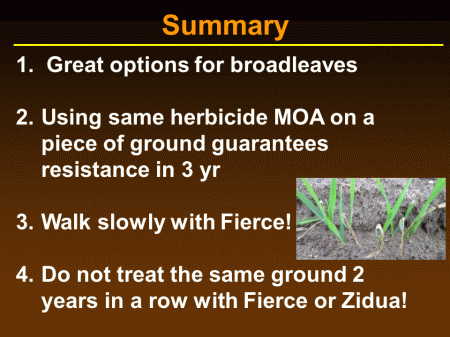 Summary<BR>1.  Great options for broadleaves <BR>  <BR>Using same herbicide MOA on a piece of ground guarantees resistance in 3 yr <BR> <BR>Walk slowly with Fierce! <BR> <BR>Do not treat the same ground 2 years in a row with Fierce or Zidua!<BR>