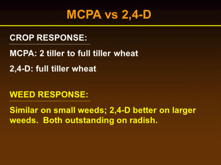 CROP RESPONSE: <BR>MCPA: 2 tiller to full tiller wheat <BR>2,4-D: full tiller wheat<BR>WEED RESPONSE: <BR>Similar on small weeds; 2,4-D better on larger weeds.  Both outstanding on radish.<BR>MCPA vs 2,4-D <BR>