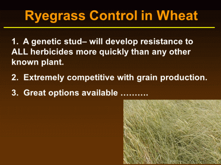 Ryegrass Control in Wheat <BR>1.  A genetic stud– will develop resistance to ALL herbicides more quickly than any other known plant. <BR>2.  Extremely competitive with grain production. <BR>3.  Great options available ……….<BR>