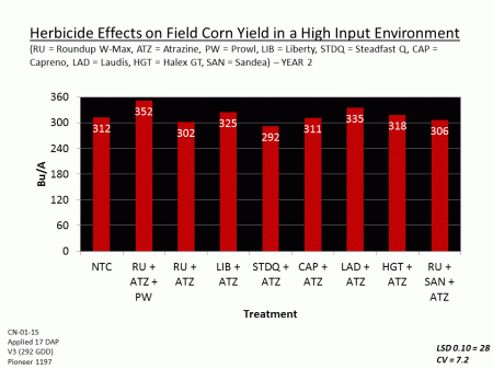 Herbicide Effects on Field Corn Yield in a High Input Environment (RU = Roundup W-Max, ATZ = Atrazine, PW = Prowl, LIB = Liberty, STDQ = Steadfast Q, CAP = Capreno, LAD = Laudis, HGT = Halex GT, SAN = Sandea) – YEAR 2<BR>CN-01-15 <BR>Applied 17 DAP <BR>V3 (292 GDD) <BR>Pioneer 1197<BR>LSD 0.10 = 28 <BR>CV = 7.2<BR>