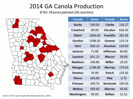 2014 GA Canola Production 8765.78 acres planted (28 counties)<BR>Source: FSA Crop Acreage Data Report (January 2015)<BR>