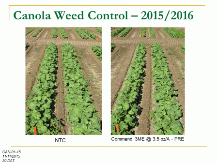 Canola Weed Control – 2015/2016<BR>CAN-01-15 <BR>11/11/2015 <BR>30 DAT<BR>NTC<BR>Command 3ME @ 3.5 oz/A - PRE<BR>