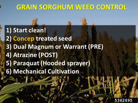 GRAIN SORGHUM WEED CONTROL<BR> Start clean! <BR> Concep treated seed <BR> Dual Magnum or Warrant (PRE) <BR> Atrazine (POST) <BR> Paraquat (Hooded sprayer) <BR> Mechanical Cultivation<BR>