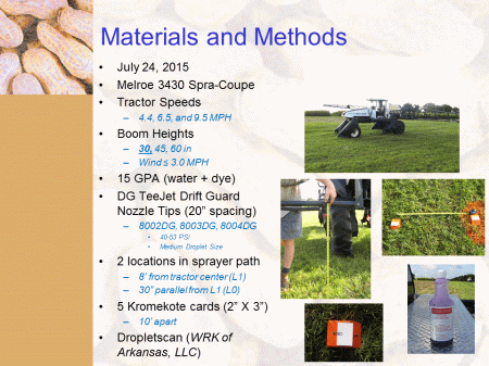 Materials and Methods<BR>July 24, 2015 <BR>Melroe 3430 Spra-Coupe <BR>Tractor Speeds <BR>4.4, 6.5, and 9.5 MPH <BR>Boom Heights <BR>30, 45, 60 in <BR>Wind = 3.0 MPH <BR>15 GPA (water + dye) <BR>DG TeeJet Drift Guard Nozzle Tips (20” spacing) <BR>8002DG, 8003DG, 8004DG <BR>40-53 PSI <BR>Medium Droplet Size <BR>2 locations in sprayer path <BR>8’ from tractor center (L1) <BR>30” parallel from L1 (L0) <BR>5 Kromekote cards (2” X 3”) <BR>10’ apart <BR>Dropletscan (WRK of Arkansas, LLC)<BR>