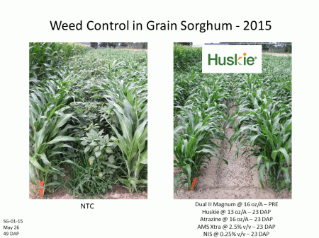 Weed Control in Grain Sorghum - 2015<BR>SG-01-15 <BR>May 26 <BR>49 DAP<BR>NTC<BR>Dual II Magnum @ 16 oz/A – PRE <BR>Huskie @ 13 oz/A – 23 DAP <BR>Atrazine @ 16 oz/A – 23 DAP <BR>AMS Xtra @ 2.5% v/v – 23 DAP <BR>NIS @ 0.25% v/v – 23 DAP<BR>