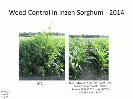 Weed Control in Inzen Sorghum - 2014<BR>SG-01-14 <BR>June 19 <BR>31 DAP<BR>NTC<BR>Dual II Magnum 7.62EC @ 16 oz/A – PRE <BR>Zest 0.33SC @ 12 oz/A – POST + <BR>Atrazine 90DF @ 13.3 oz/A – POST + <BR>COC @ 1% v/v - POST<BR>