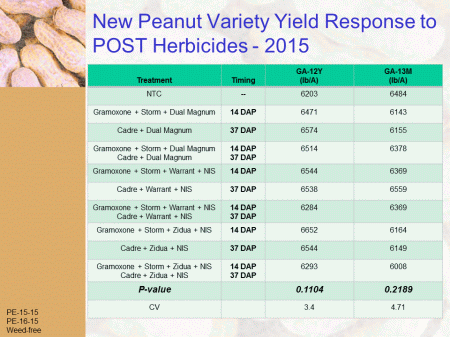 New Peanut Variety Yield Response to POST Herbicides - 2015<BR>PE-15-15 <BR>PE-16-15 <BR>Weed-free<BR>