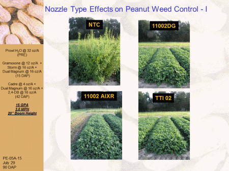 Nozzle Type Effects on Peanut Weed Control - I<BR>PE-05A-15 <BR>July 29 <BR>90 DAP<BR>NTC<BR>11002DG<BR>11002 AIXR<BR>TTI 02<BR>Prowl H2O @ 32 oz/A <BR>(PRE) <BR> <BR>Gramoxone @ 12 oz/A  + <BR>Storm @ 16 oz/A + <BR>Dual Magnum @ 16 oz/A <BR> (15 DAP) <BR> <BR>Cadre @ 4 oz/A + <BR>Dual Magnum @ 16 oz/A + <BR>2,4-DB @ 16 oz/A <BR>(42 DAP) <BR> <BR>15 GPA <BR>3.0 MPH <BR>20” Boom Height <BR> <BR>