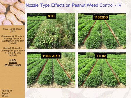 Nozzle Type Effects on Peanut Weed Control - IV<BR>PE-05B-15 <BR>August 3 <BR>91 DAP<BR>Prowl H2O @ 32 oz/A <BR>(PRE) <BR> <BR>Gramoxone @ 12 oz/A  + <BR>Storm @ 16 oz/A + <BR>Dual Magnum @ 16 oz/A <BR> (23 DAP) <BR> <BR>Cobra @ 12.5 oz/A + <BR>Dual Magnum @ 16 oz/A + <BR>2,4-DB @ 16 oz/A <BR>(36 DAP) <BR> <BR>15 GPA <BR>3.0 MPH <BR>20” Boom Height <BR> <BR>