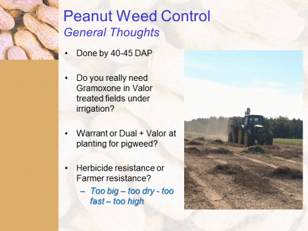 Peanut Weed Control General Thoughts<BR>Done by 40-45 DAP <BR> <BR>Do you really need  Gramoxone in Valor treated fields under irrigation? <BR> <BR>Warrant or Dual + Valor at planting for pigweed? <BR> <BR>Herbicide resistance or Farmer resistance? <BR>Too big – too dry - too fast – too high<BR>