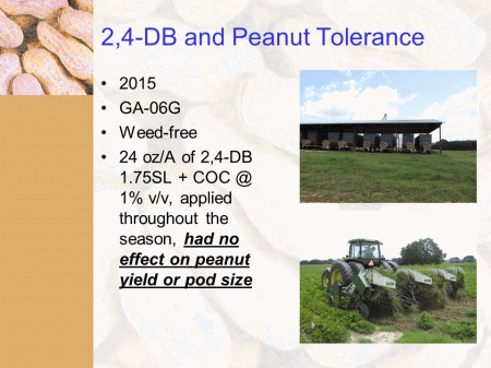 2,4-DB and Peanut Tolerance<BR>2015 <BR>GA-06G <BR>Weed-free <BR>24 oz/A of 2,4-DB 1.75SL + COC @ 1% v/v, applied throughout the season, had no effect on peanut yield or pod size<BR>
