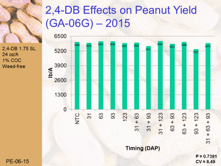 2,4-DB Effects on Peanut Yield (GA-06G) – 2015<BR>PE-06-15<BR>2,4-DB 1.75 SL <BR>24 oz/A <BR>1% COC <BR>Weed-free<BR>P = 0.7391 <BR>CV = 8.49<BR>