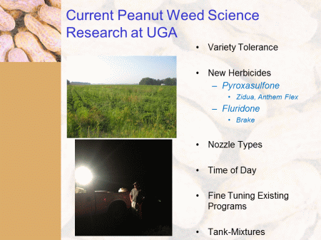 Current Peanut Weed Science Research at UGA<BR>Variety Tolerance <BR> <BR>New Herbicides <BR>Pyroxasulfone <BR>Zidua, Anthem Flex <BR>Fluridone <BR>Brake <BR> <BR>Nozzle Types <BR> <BR>Time of Day <BR> <BR>Fine Tuning Existing Programs <BR> <BR>Tank-Mixtures <BR>
