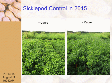 Sicklepod Control in 2015<BR>+ Cadre<BR>- Cadre<BR>PE-13-15 <BR>August 12 <BR>100 DAP<BR>