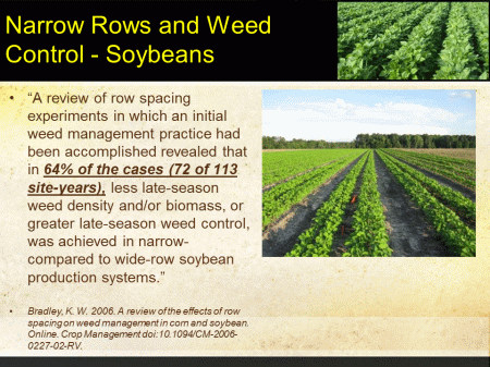 Narrow Rows and Weed Control - Soybeans<BR>“A review of row spacing experiments in which an initial weed management practice had been accomplished revealed that in 64% of the cases (72 of 113 site-years), less late-season weed density and/or biomass, or greater late-season weed control, was achieved in narrow- compared to wide-row soybean production systems.” <BR> <BR>Bradley, K. W. 2006. A review of the effects of row spacing on weed management in corn and soybean. Online. Crop Management doi:10.1094/CM-2006-0227-02-RV. <BR>