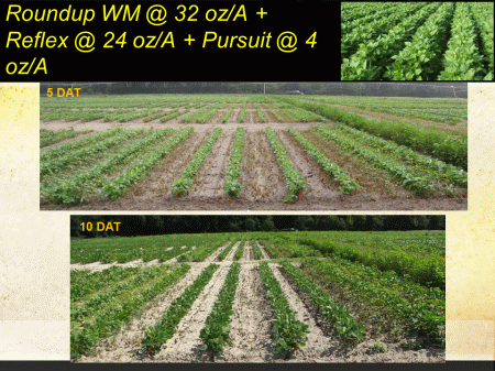 Roundup WM @ 32 oz/A + Reflex @ 24 oz/A + Pursuit @ 4 oz/A <BR>5 DAT<BR>10 DAT<BR>