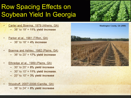 Row Spacing Effects on Soybean Yield In Georgia<BR>Carter and Boerma, 1979 (Athens, GA) <BR>38” to 19” = 11% yield increase <BR> <BR>Parker et al., 1981 (Tifton, GA) <BR>36” to 18” = 4% increase  <BR> <BR>Boerma and Ashley, 1982 (Plains, GA) <BR>36” to 20” = 17% yield increase <BR> <BR>Ethredge et al., 1989 (Plains, GA) <BR>30” to 20” = 8% yield increase <BR>30” to 10” = 11% yield increase <BR>20” to 10” = 3% yield increase <BR> <BR>Woodruff, 2007-2008 (Camilla, GA) <BR>36” to 24” = 8% yield increase <BR> <BR> <BR>Washington County, GA (2008)<BR>