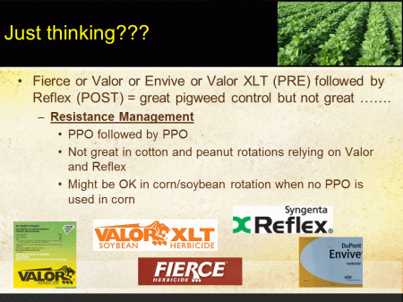 Just thinking???<BR>Fierce or Valor or Envive or Valor XLT (PRE) followed by Reflex (POST) = great pigweed control but not great ……. <BR>Resistance Management <BR>PPO followed by PPO <BR>Not great in cotton and peanut rotations relying on Valor and Reflex <BR>Might be OK in corn/soybean rotation when no PPO is used in corn<BR>