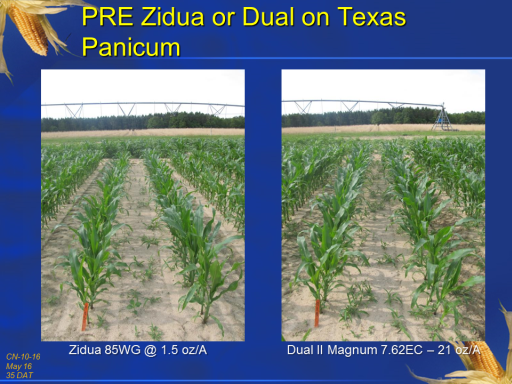 PRE Zidua or Dual on Texas Panicum<BR>Zidua 85WG @ 1.5 oz/A<BR>Dual II Magnum 7.62EC – 21 oz/A<BR>CN-10-16 <BR>May 16 <BR>35 DAT<BR>