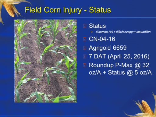 Field Corn Injury - Status<BR>Status <BR>dicamba-NA + diflufenzopyr + isoxadifen <BR>CN-04-16 <BR>Agrigold 6659 <BR>7 DAT (April 25, 2016) <BR>Roundup P-Max @ 32 oz/A + Status @ 5 oz/A<BR>
