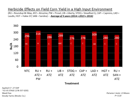 Herbicide Effects on Field Corn Yield in a High Input Environment (RU = Roundup W-Max, ATZ = Atrazine, PW = Prowl, LIB = Liberty, STDQ = Steadfast Q, CAP = Capreno, LAD = Laudis, HGT = Halex GT, SAN = Sandea) –  Average of 3 years (2014 + 2015 + 2016)<BR>Applied 17 -27 DAP <BR>~V2-V5 STAGE (178-337 GDD) <BR>Weed-free <BR>Dowdy Farms (Brooks Co.)<BR>BC<BR>A<BR>ABC<BR>C<BR>C<BR>AB<BR>C<BR>C<BR>Pairwise t-tests: LS Means <BR>P= 0.10<BR>