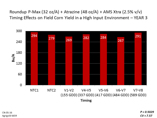 Roundup P-Max (32 oz/A) + Atrazine (48 oz/A) + AMS Xtra (2.5% v/v) Timing Effects on Field Corn Yield in a High Input Environment – YEAR 3<BR>CN-05-16 <BR>Agrigold 6659<BR>P = 0.5029 <BR>CV = 7.57<BR>