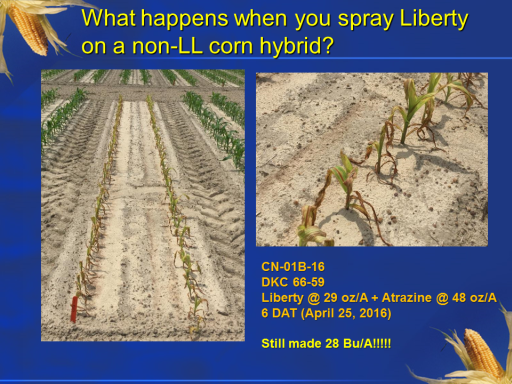 What happens when you spray Liberty on a non-LL corn hybrid?<BR>CN-01B-16 <BR>DKC 66-59 <BR>Liberty @ 29 oz/A + Atrazine @ 48 oz/A <BR>6 DAT (April 25, 2016) <BR> <BR>Still made 28 Bu/A!!!!!<BR>