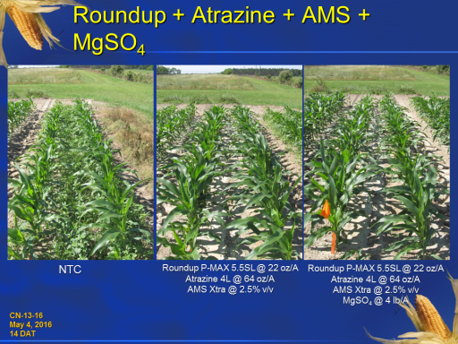 Roundup + Atrazine + AMS + MgSO4<BR>NTC<BR>Roundup P-MAX 5.5SL @ 22 oz/A <BR>Atrazine 4L @ 64 oz/A <BR>AMS Xtra @ 2.5% v/v<BR>Roundup P-MAX 5.5SL @ 22 oz/A <BR>Atrazine 4L @ 64 oz/A <BR>AMS Xtra @ 2.5% v/v <BR>MgSO4 @ 4 lb/A<BR>CN-13-16 <BR>May 4, 2016 <BR>14 DAT <BR>