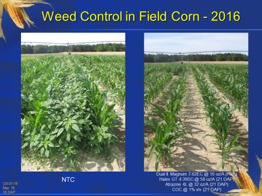 Weed Control in Field Corn - 2016<BR>CN-01-16 <BR>May 16 <BR>35 DAP<BR>NTC<BR>Dual II Magnum 7.62EC @ 16 oz/A (PRE) <BR>Halex GT 4.39SC @ 58 oz/A (21 DAP) <BR>Atrazine 4L @ 32 oz/A (21 DAP) <BR>COC @ 1% v/v (21 DAP)<BR>