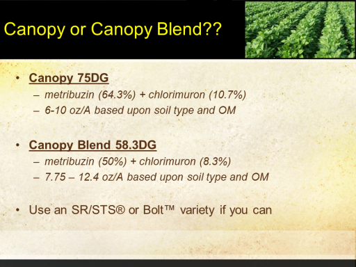 Canopy or Canopy Blend??<BR>Canopy 75DG <BR>metribuzin (64.3%) + chlorimuron (10.7%) <BR>6-10 oz/A based upon soil type and OM <BR> <BR>Canopy Blend 58.3DG <BR>metribuzin (50%) + chlorimuron (8.3%) <BR>7.75 – 12.4 oz/A based upon soil type and OM <BR> <BR>Use an SR/STS® or Bolt™ variety if you can<BR>