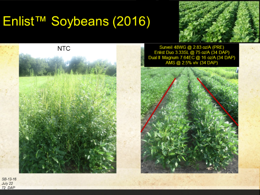 Enlist™ Soybeans (2016)<BR>SB-13-16 <BR>July 22 <BR>72  DAP<BR>NTC<BR>Surveil 48WG @ 2.83 oz/A (PRE) <BR>Enlist Duo 3.33SL @ 75 oz/A (34 DAP) <BR>Dual II Magnum 7.64EC @ 16 oz/A (34 DAP) <BR>AMS @ 2.5% v/v (34 DAP)<BR>