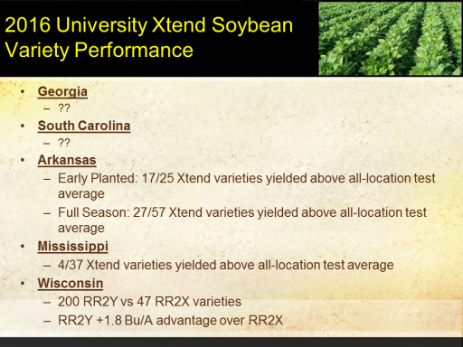 2016 University Xtend Soybean Variety Performance<BR>Georgia <BR>?? <BR>South Carolina <BR>?? <BR>Arkansas <BR>Early Planted: 17/25 Xtend varieties yielded above all-location test  average <BR>Full Season: 27/57 Xtend varieties yielded above all-location test average <BR>Mississippi <BR>4/37 Xtend varieties yielded above all-location test average <BR>Wisconsin <BR>200 RR2Y vs 47 RR2X varieties <BR>RR2Y +1.8 Bu/A advantage over RR2X <BR>