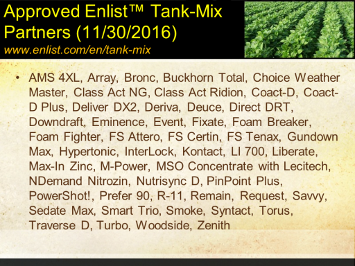 Approved Enlist™ Tank-Mix Partners (11/30/2016) www.enlist.com/en/tank-mix<BR>AMS 4XL, Array, Bronc, Buckhorn Total, Choice Weather Master, Class Act NG, Class Act Ridion, Coact-D, Coact-D Plus, Deliver DX2, Deriva, Deuce, Direct DRT, Downdraft, Eminence, Event, Fixate, Foam Breaker, Foam Fighter, FS Attero, FS Certin, FS Tenax, Gundown Max, Hypertonic, InterLock, Kontact, LI 700, Liberate, Max-In Zinc, M-Power, MSO Concentrate with Lecitech, NDemand Nitrozin, Nutrisync D, PinPoint Plus, PowerShot!, Prefer 90, R-11, Remain, Request, Savvy, Sedate Max, Smart Trio, Smoke, Syntact, Torus, Traverse D, Turbo, Woodside, Zenith<BR>