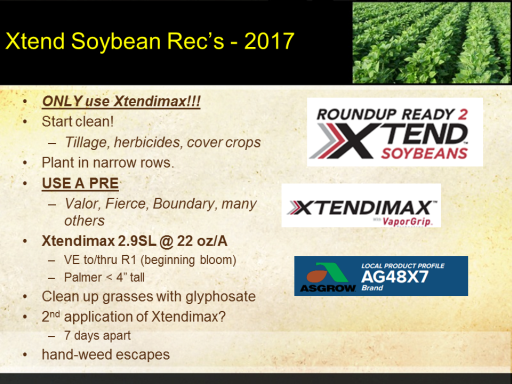 Xtend Soybean Rec’s - 2017<BR>ONLY use Xtendimax!!! <BR>Start clean! <BR>Tillage, herbicides, cover crops <BR>Plant in narrow rows. <BR>USE A PRE <BR>Valor, Fierce, Boundary, many others <BR>Xtendimax 2.9SL @ 22 oz/A <BR>VE to/thru R1 (beginning bloom) <BR>Palmer < 4” tall <BR>Clean up grasses with glyphosate <BR>2nd application of Xtendimax? <BR>7 days apart <BR>hand-weed escapes<BR>