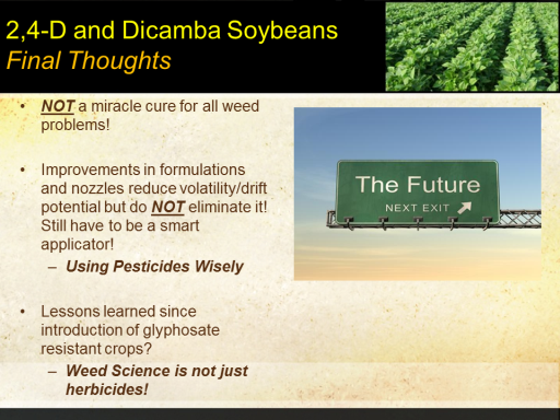 2,4-D and Dicamba Soybeans Final Thoughts<BR>NOT a miracle cure for all weed problems! <BR> <BR>Improvements in formulations and nozzles reduce volatility/drift potential but do NOT eliminate it!  Still have to be a smart applicator! <BR>Using Pesticides Wisely <BR> <BR>Lessons learned since introduction of glyphosate resistant crops? <BR>Weed Science is not just herbicides! <BR> <BR>