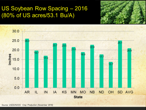 US Soybean Row Spacing – 2016 (80% of US acres/53.1 Bu/A)<BR>Source: USDA/NASS.  Crop Production (November 2016)<BR>